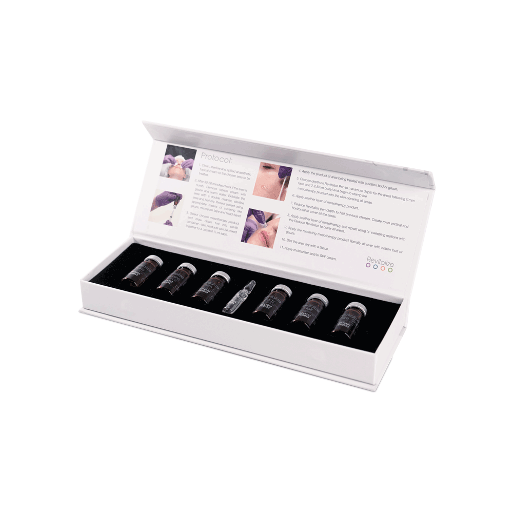 Testovací set mezoterapie Revitalize je ideální pro ty, kteří chtějí vyzkoušet různé produkty z nabídky řady mezoterapie Revitalize.